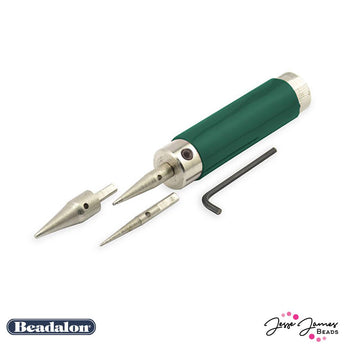 Sandra Lupo invented this ingenious tool to create custom bead cones and bead caps for strung designs, earrings, Kumihimo and more! The 3 different sizes of cone mandrels fit into the base of the tool for easy storage. To use, simply insert your desired mandrel into the base and tighten into place with the included Allen wrench. Place your wire into the insertion hole in the mandrel, hold it in place with your thumb, then gently twist the mandrel until the wire spiral reaches the top. The mandrels can also be used with the Professional Coiling Gizmo Chuck. Use the tool with a bench vise by inserting the base into the vise. Spiral a coil around a large gauge wire for an incredibly beautiful custom cone. Conetastic Cone Mandrel Set, 5mm x 2mm (0.20in x 0.08in),8mm x 2mm (0.31in x 0.08in), 11mm x 2mm(0.43in x 0.08in)