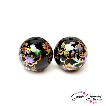 These 18mm opaque black Japanese Tensha bead layered with holographic magic and gold leaf detailing. This set of Japanese Tensha beads are crafted by hand using a delicate holographic decal set gently on a 18mm round opaque black acrylic ball. Each bead is then fully laquered with another acrylic coating to protect the beads from scratching and abrasion. Japanese Tensa beads have designs that are printed perfectly and fully covering each side of the bead. Each bead is made individually by hand. 2 beads per order.