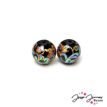 These 12mm opaque black Japanese Tensha bead layered with holographic magic and gold leaf detailing. This set of Japanese Tensha beads are crafted by hand using a delicate holographic decal set gently on a 12mm round opaque black acrylic ball. Each bead is then fully laquered with another acrylic coating to protect the beads from scratching and abrasion. Japanese Tensa beads have designs that are printed perfectly and fully covering each side of the bead. Each bead is made individually by hand. 2 beads per order.