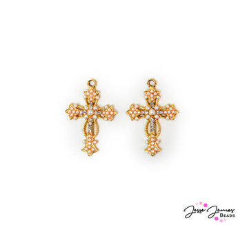 These dazzling crosses are perfect for enhancing necklaces, bracelets, earrings, or even keychains. Each cross features a bright gold plated base decorated with mini rhinestones and glass pearl accents. The combination of gold and rhinestones exudes elegance and sophistication, making this pair an eye-catching addition to any piece. Comes in sets of 2. Each pendant measures 34mm x 23mm x 4mm.