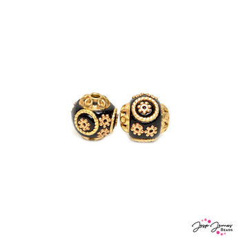 These elegant midnight inspired beads feature an ebony black base coat accented with gold metal accents. Each bead measures 15 mm.