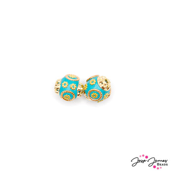 Enjoy a splash of bright teal beads. Each clay bead features a bright teal color accented with bright gold metal accents. Each bead measures 16mm with a hole size of 2mm.
