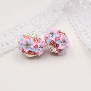 This enchanting pair of boho beads features deep pink tones adorned with sparkling pink rhinestones, soft pink and purple blooms, and elegant silver bead caps. Rich in texture and color, they add a whimsical, romantic touch to earrings, bracelets, or necklace designs. Measures 20mm X 16mm. Sold as a pair.