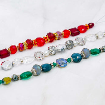 Get into the Christmas spirit with this glass strand trio. Each bundle includes 1 red, one teal, and one crystal bead strand.