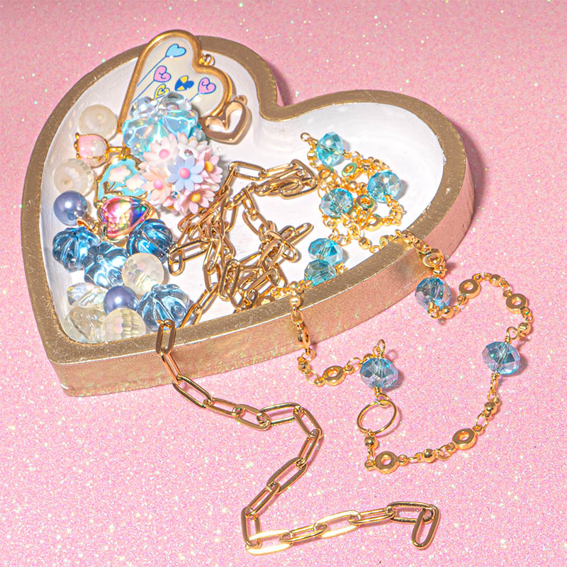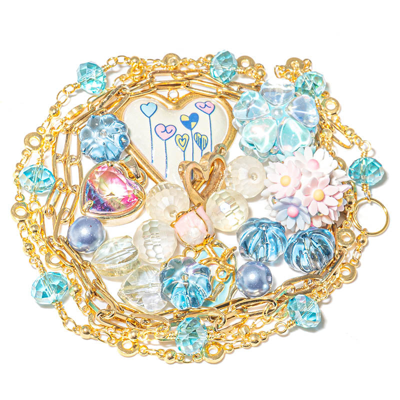 Create sweet, whimsical jewelry with this Bead Mix & Chain Bundle featuring a light blue chain, a heart pendant with a pink heart design, and a coordinating mini bead mix in soft blue and pink tones. Perfect for DIY necklaces or bracelets, this set brings a playful, pastel charm to every creation.