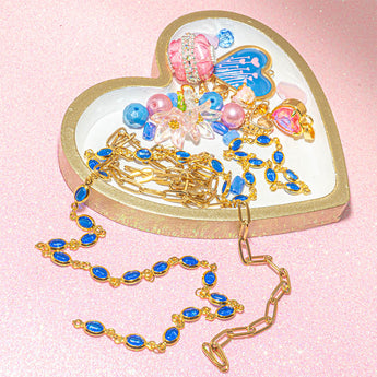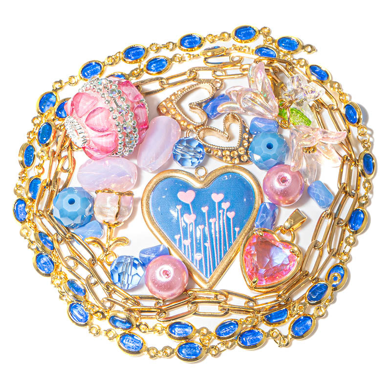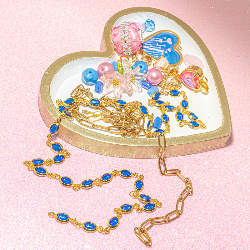 Craft a bold, romantic statement with this Bead Mix & Chain Bundle featuring a dark blue chain, a heart pendant with a pink balloon heart on a blue background, and a coordinating mini bead mix in dark blue, pink, and hints of green. Perfect for DIY necklaces or bracelets, this set brings a playful yet moody pop of color to your jewelry creations.