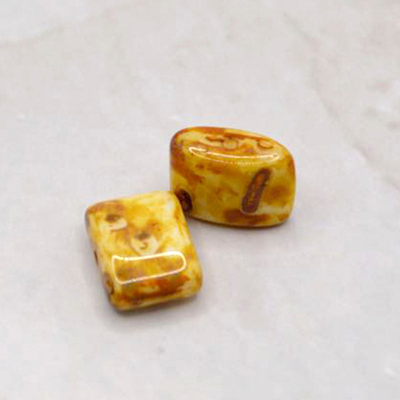 Bring warm, earthy tones to your jewelry designs with this set of 12 Glass Tile Beads in Caramel Crunch. Each bead features a flat, rounded-edge rectangle shape with a marbled blend of cream, light brown, and dark brown hues. Perfect for creating stylish tile bead bracelets, necklaces, and earrings with a cozy, natural feel. 8mm x 11mm x 5mm. 12 per set.