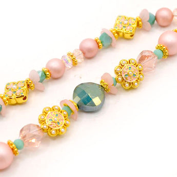Soft, elegant, and full of charm, the Duo Bead Strand in Peony is a 5 inch double strand featuring a delicate palette of teal blue, peachy pink, and gold. This strand pairs Victorian-inspired metal enamel focal beads with acrylic petal bead caps, custom-dyed faux pearls, and sparkling glass beads. Perfect for creating romantic earrings, bracelets, or layered necklaces that exude timeless beauty. Largest bead measures 2mm. Smallest bead measures 8mm.