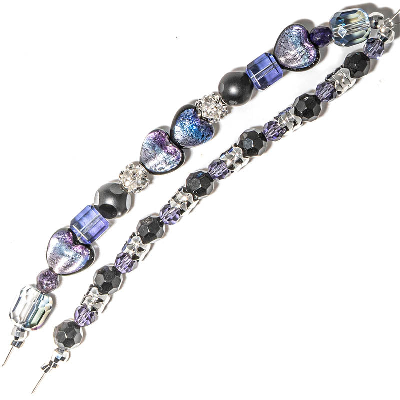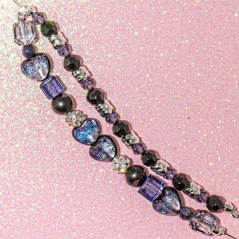 Purple Passion Duo Bead Strand is a dramatic, love-soaked mix featuring dazzling dichroic glass heart beads in black, purple, and blue. Finished with silver metal spacers and bead caps plus plenty of coordinating glass beads, this strand is perfect for creating bold, statement jewelry with a moody, romantic vibe. Largest bead measures 10mm. Smallest bead measures 6mm x 4mm. Approx. 44 beads per set.