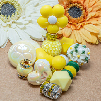 Add a bright touch to your next project with these stunning yellow beads! Each mix includes Silicone flower beads, silicone cubes, silicone rounds, silicone heishi, glass focal beads, acrylic beads, and rhinestone spacers. Each mix includes 20 pieces. Largest piece measures 28mm x 28mm x 8mm. Smallest piece measures 10mm x 3mm. Restock Preorder will ship week of 7/7