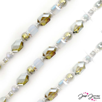This subtle green pairs beautifully with accenting colors. This 7 inch bead strand features an inspired assortment of faceted glass shapes and silver plated metal accents. Largest bead on strand measures 18mm x 12mm x 8mm. Smallest bead on strand measures 5mm.