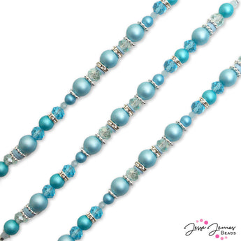 Bright and fun, this aqua blue hue is ready to stand out! The 2022 Pantone Pearls Collection from Jesse James Beads includes custom dyed pearl beads with matching faceted glass, custom dyed heishis, and metal spacers. Largest bead on strand measures 10mm. Smallest bead on strand measures 6mm x 1mm. Please note, some pearls may have a speckled look due to custom dying.