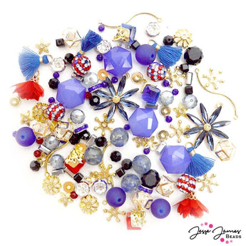 Light up the Summer night sky with this dark blend of blue, red, and gold. Each Firework inspired bead mix features faceted glass, thread tassels, caged crystals, custom metal rhinestone spacers, floral tassels, large rhinestone flower charms, rhinestone covered beads, and so much more. Largest bead in mix measures 27mm x 25mm x 4mm. Smallest bead in mix measures 5mm x 6mm.