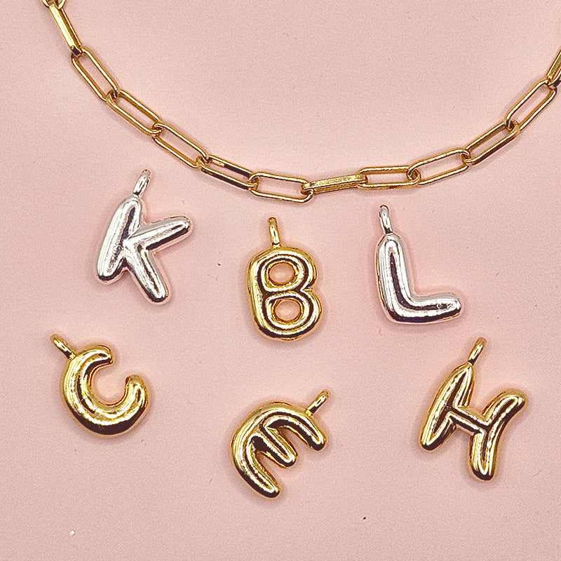 Customize everything with these playful bubble letter jewelry charms. Spell out names or create initial jewelry. Balloon letter charms are super trendy and come in gold and silver color. Tarnish-resistant! It can be worn in water.