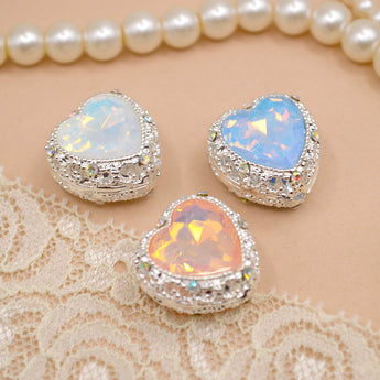 This exquisite heart-shaped focal bead features intricate filigree details on the sides, framing a stunning glass opal-like heart at its center. Soft and luminous, it adds a touch of romantic elegance, making it the perfect centerpiece for bracelets, necklaces, or eye-catching earrings with a dreamy, coquette-inspired charm. Measures 20mm. One per order.
