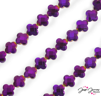 Clover faceted glass beads in metallic purple are perfect for purple lovers, bold beaders, and jewelry that stands out. If any of the above is your style, you are going to want to make these beads yours. Each piece measures 12mm x 12mm x 5mm. Each strand contains approx. 60 beads!