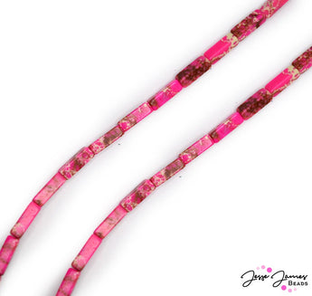 Don't forget your pink hues Darklin'. This beautiful set of rectangular beads features a blend of pinks and stoney gold hues marbled together. Each bead features it's own personality with unique color and marbling. 30 pieces per strand. Pink Impression Jasper. Each bead measures 4x13mm