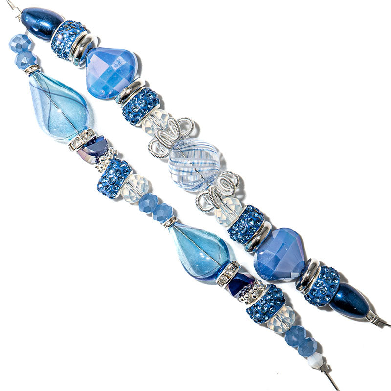 This winter themed 4 inch bead strand duo features a chilling blue hue. Each strand includes a blend of hand-blown glass lampwork beads, faceted glass, large hole beads, and silver-plated brass metal spacers. Largest bead on strand measures 20mm x 14mm. Smallest bead measures 4mm. Perfect for holiday themed jewelry creating.