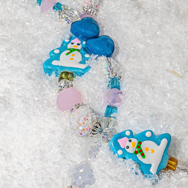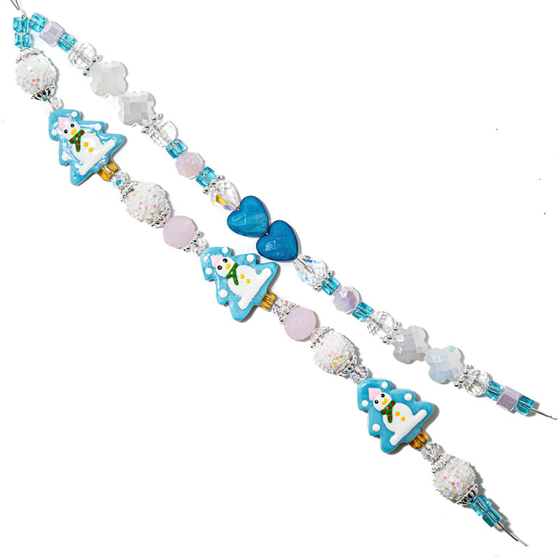 This adorable snowman inspired duo of 7 inch bead strands features stunning lampwork sugar cookie-style snowman beads, faceted glass rondelles, faceted glass hearts, faceted glass teardrops, faceted glass cubes, rhinestone encrusted clay beads, and silver plated brass bead spacers. Largest bead measures 25mm x 20mm x 7mm. Smallest piece measures 4mm.