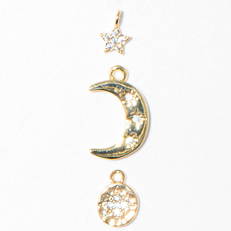 This celestial trio of charm features 18K gold-plating making these charm water resistant and tarnish resistant. Each charm features micro zirconia rhinestones for additional sparkle and shine. Largest piece in set measures 16mm x 10mm x 2mm. Smallest piece measures 8mm x 5mm x 1.5mm.