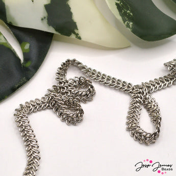 Add a bold, edgy touch to your jewelry designs with this intricately crafted silver metal chain. Featuring a twisted pattern that evokes strength and movement, it brings a striking, textured element to any necklace, bracelet, or anklet. Perfect for creating dramatic pieces with a rebellious flair, this chain is both versatile and visually captivating. Chain is 6mm thick. Sold in 18 inch cuts.