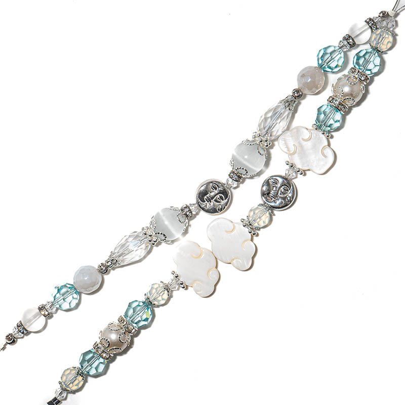 Look to the skies for inspiration with this Glass Bead Strand Duo in Beyond The Clouds. This light color mix features shades of blue, and the stars of the show are three dreamy white clouds and two shining silver beads featuring a unique man in the moon design. Each 7-inch strand contains 53 pieces. Beads range in size from 1 mm to 11 mm.