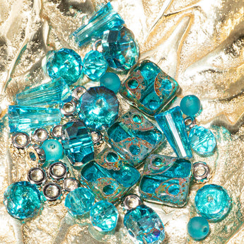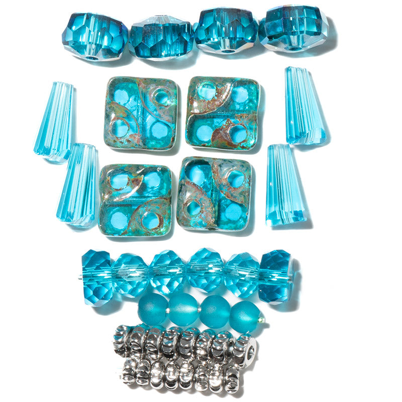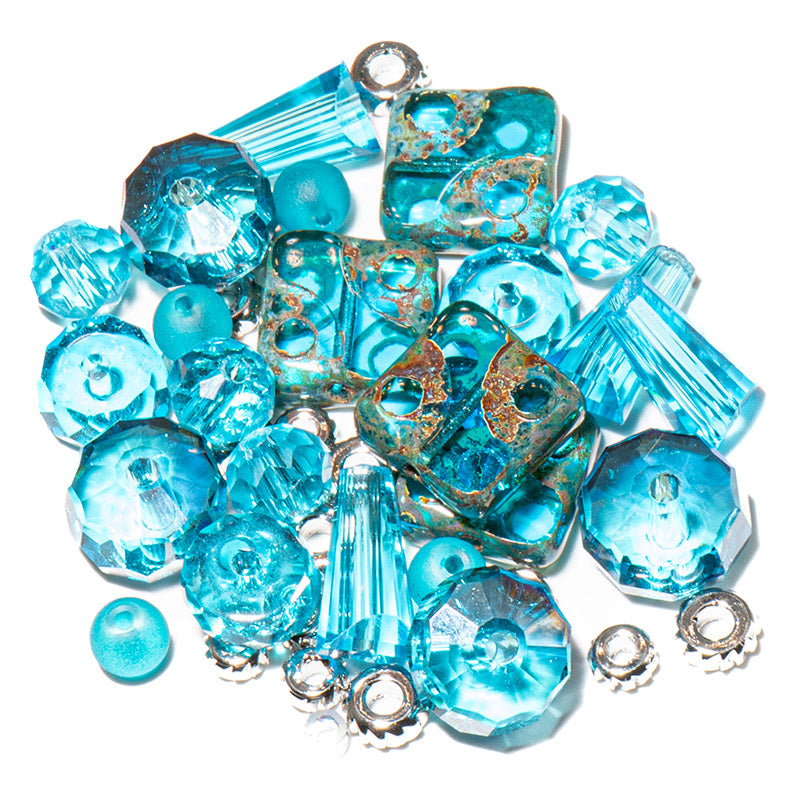 This aqua colored bead mix features bold colors and undersea-inspired shapes for stunning beachside or poolside jewelry creations. Each mix includes 4 Czech Fire Polish Cut and Engraved Window beads. These beads are accented by faceted glass flat rondelles, faceted glass classic rondelles, glass frosted round beads, faceted glass daggers, and silver metal bead spacers. Largest beads measures 10mm. Smallest beads measures 4mm x 2mm.