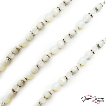 Sparkling Moonstone and Crystal come together in this pure white bead strand. This 7 inch bead strand features beautiful Dakota Stones natural cut crystals and moonstone paired with JJB glass and custom metal spacers. Largest bead on strand measures 10mm.