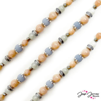 A menagerie of beautiful moonstone. This 7 inch bead strand features a beautiful blend of peach and grey moonstone paired with JJB glass and custom metal spacers. This blend of colors gives you a playful yet sophisticated palette to work with. Largest bead on strand measures 10mm.