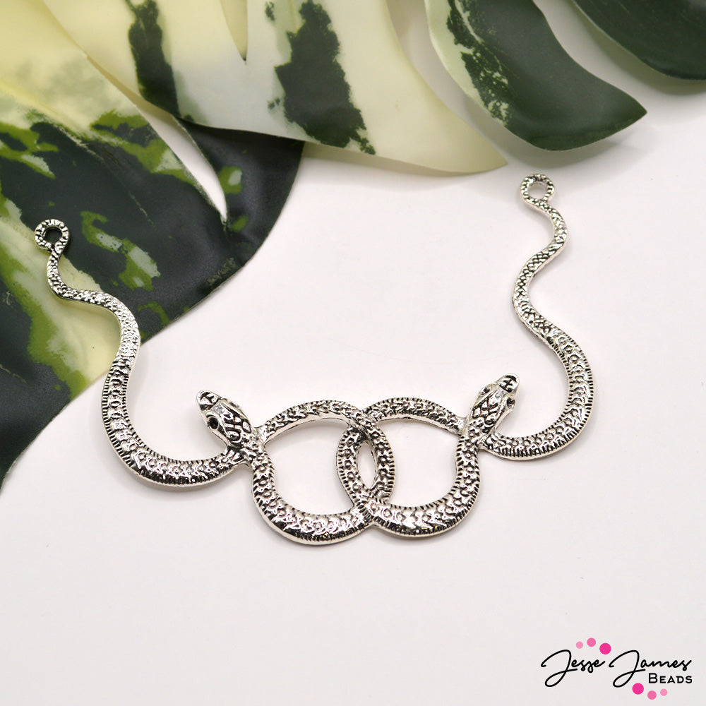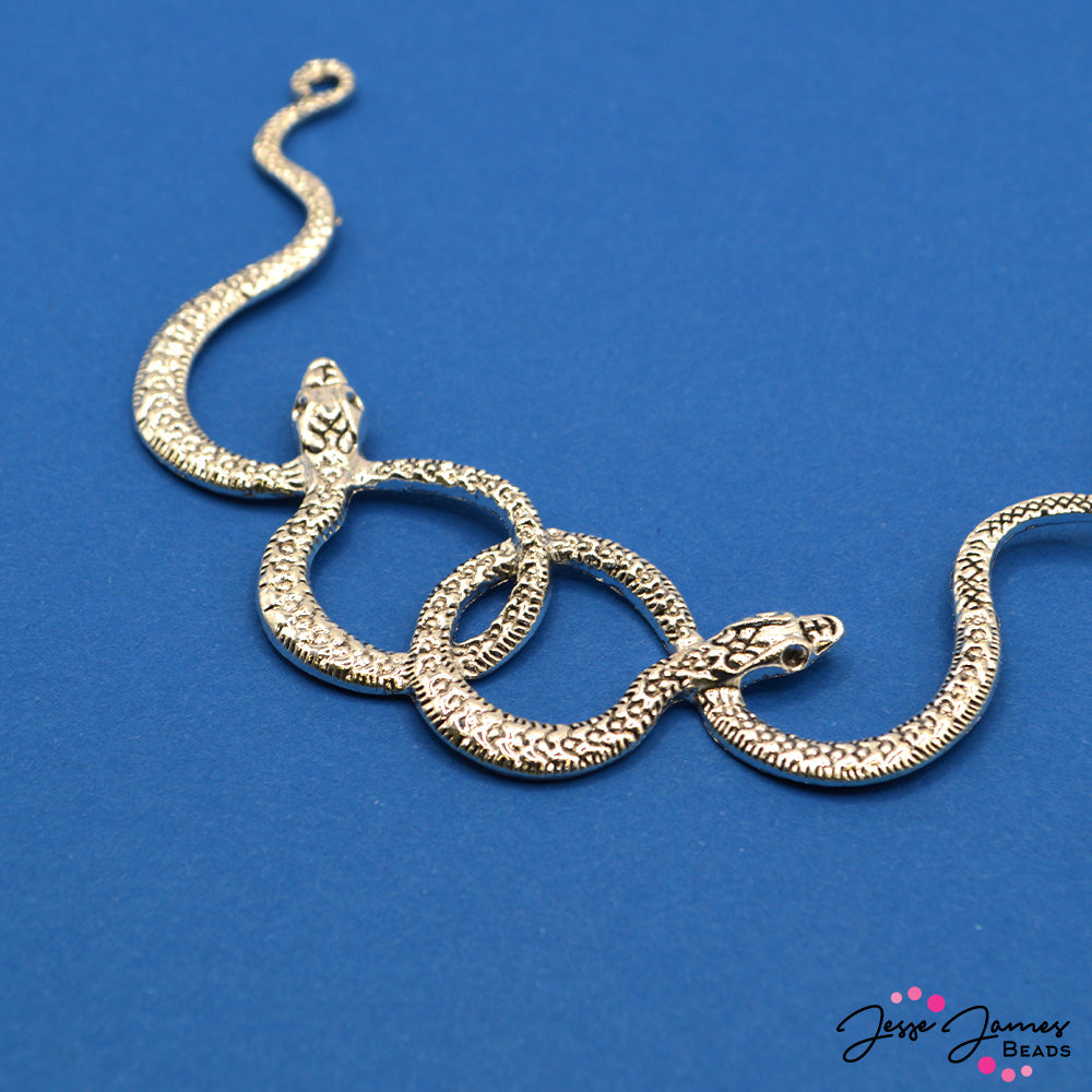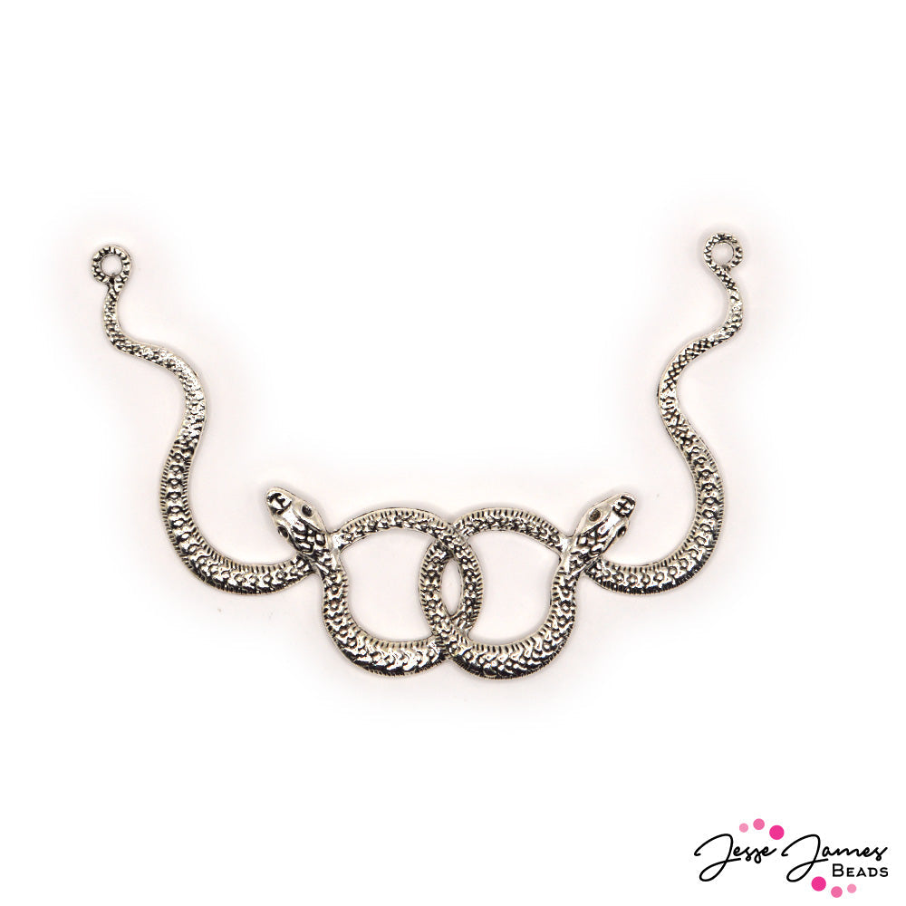 This striking necklace focal features two silver snakes intricately wrapped around each other, symbolizing unity and transformation. The detailed craftsmanship and sleek silver finish make it the perfect centerpiece for creating bold, nature-inspired jewelry. Ideal for statement necklaces, this piece adds a touch of elegance and powerful symbolism to your designs. Measures 100mm X 71mm x 4.3mm.