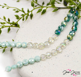This stunning green duo of bead strands features an ombre of crystal, green, and seafoam color. Each bead measures 8mm x 5mm. 14-inches of beads in total, approx. 36 beads to create with! Add this stunning ombre of green hues to creating bracelets, necklaces, and more.