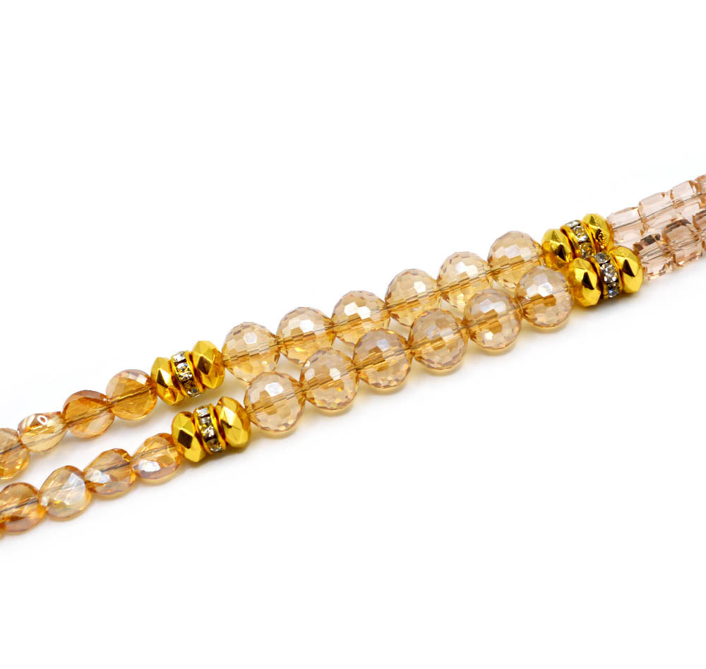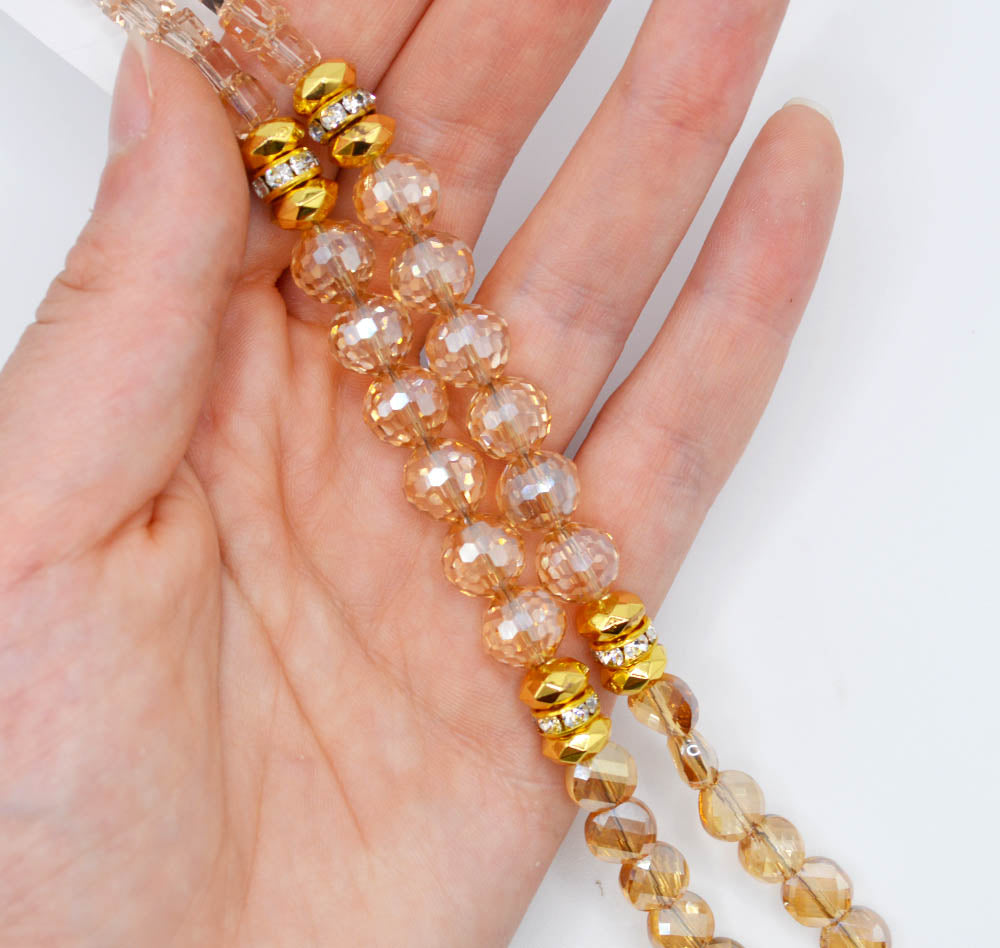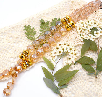 Perfect for neutral and earthy design projects, this tan bead strand features a beautiful blend of facets and tan hues. This 7 inch bead strand features three styles of glass beads. Glass beads range in size from 4mm to 10mm beads.