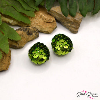 Bring texture and shine to your jewelry designs with these sequin-covered beads, featuring a shimmering green, scale-like pattern. Their unique design evokes the beauty of snake eggs, making them perfect for adding a touch of intrigue to bracelets, necklaces, or earrings. Ideal for creating bold pieces with a hint of glamour. Each bead measures 18mm.