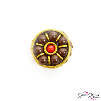 Adventure to the summit with this Mount Everest inspired Tibetan focal bead. The colors in this bead reflect the brown marble and sparkling sunlight setting on the Mount Everest summit. Each focal bead features golden accents surround brown enamel with a red center. Each bead measures 19.9 mm x 11.3 mm.