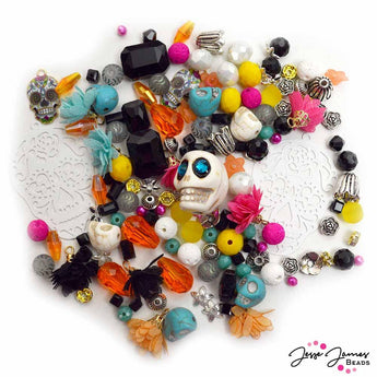 Celebrate Day of the Dead with this bright bead mix. Paying tribute to the celebration of life with this mix packed with Marigold yellow components, bright pink and turquoise, faceted glass, skulls, large metal lace sugar skulls, charms, faceted glass, and more. Largest bead in mix measures 23mm x 18mm x 22mm. Smallest bead in mix measures 3mm.