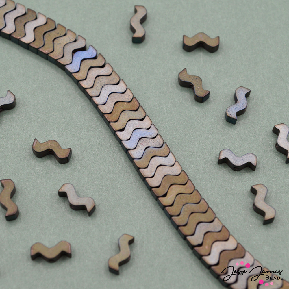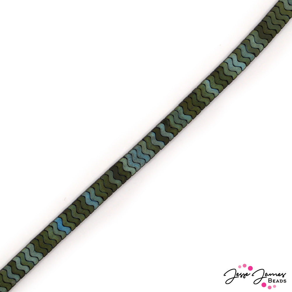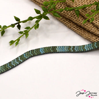 This bead strand features wiggly-shaped Hematite beads in various shades of green, creating a dynamic, textured look reminiscent of a serpent's sleek movement. The rich, earthy tones add depth and vibrancy to any jewelry piece, making it perfect for creating nature-inspired designs. Ideal for necklaces, bracelets, or earrings, these beads bring both visual interest and a touch of the wild to your creations. 6mm X 1mm. Approx 80 beads per strand.