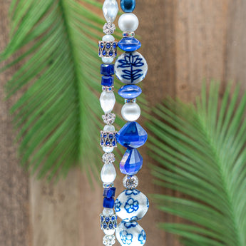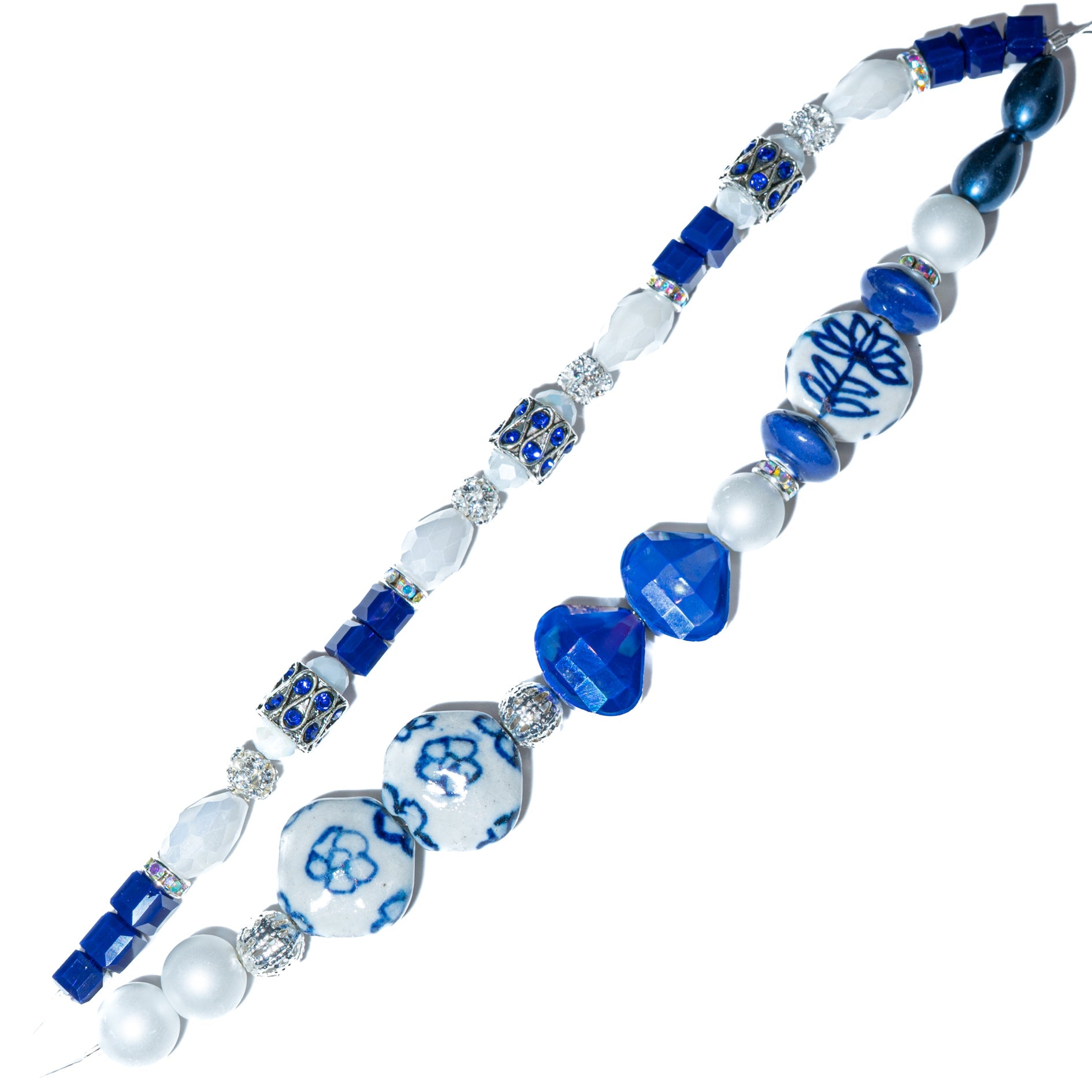 Add a rich look to your next jewelry project with this duo of Qinghua-inspired blue and white beads. Each duo of 7-inch bead strands features stunning beads, including glass matte pearls, mini faceted glass shapes, ceramic focal beads, faceted glass focal beads, silver and rhinestone metal beads, and more. The largest bead on the strand measures 18mm x 19mm x 12mm. The smallest bead on the strand measures 6mm. Perfect for creating bracelets, necklaces, or stocking up your bead stash with unique beads.