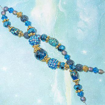 This elegant bead strand features rich blues and bright gold hues. Each 6-inch bead strand features faceted glass bicones, faceted glass rounds, mini faceted glass rondelles, rhinestone-encrusted acrylic, mini round AB glass, and gold metal accents. The largest bead in the set measures 16mm. The smallest bead in the set measures 6mm.