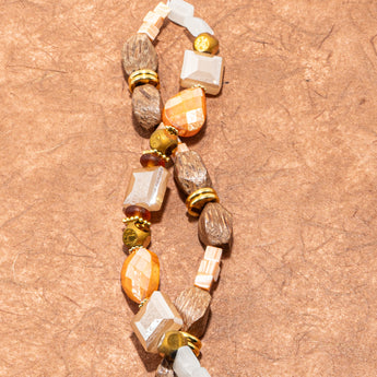 Warm up with a smooth and creamy Pumpkin Spice latte-inspired bead strand. Perfect for creating warm and cozy Autumnal jewelry, this pair of 6-inch bead strands features faceted glass orange teardrops, mini creamy orange cubes, wood beads, faceted glass squares, gold-plated metal heishi beads, and gold-plated bead spacers. Largest bead in set measures 18mm x 13mm x 8mm. Smallest bead measures 4mm x 2mm.