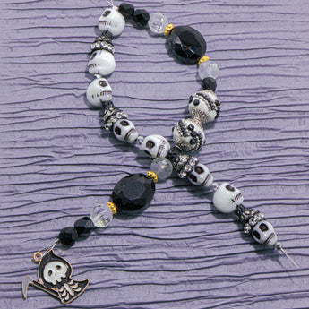 Create jewelry ready for the Monster Mash with this duo of 6-inch bead strands. This duo of strands features stunning skull beads, faceted glass ovals and faceted glass rounds, a pair of boho clay beads, black metal bead caps, black and rhinestone bead spacers, and an adorable Grim Reaper charm at the end. The largest bead on the strand measures 20mm x 16mm x 8mm. Smallest bead on the strands measures 4mm.