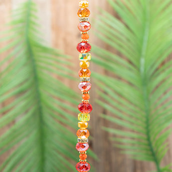 This stunning bright bead strand features sparkling fire-inspired color for bold jewelry creations. Design stunning earrings, bracelets, and more with this combo of orange, red, and yellow glass beads. Each strand features a variety of translucent and opaque rondelle glass beads paired with faceted glass bead spacers, gold metal spacers, and rhinestone gold metal spaclers. Largest bead on the strand measures 12mm x 8mm. Smallest bead on the strand measures 6mm.