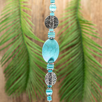 This beautiful 7-inch bead strand features an assortment of turquoise stone beads for classy beaded jewelry creations. Each strand includes a focal turquoise oval bead paired mini turquoise heishi beads, mini turquoise heishi beads, faceted turquoise round beads, and silver metal coin beads. The largest bead in this set measures 34mm x 25mm x 10m. The smallest bead in the set measures 4mm x 2mm.