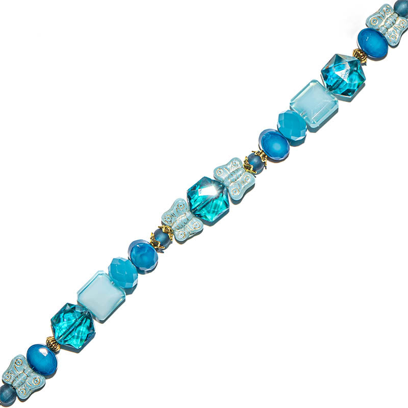 This playful teal 7-inch bead strand features a blend of glass beads including faceted glass hexagons, faceted glass ovals, faceted glass rondelles, faceted glass squares, pressed glass butterflies and gold-plated metal bead spacers and bead caps. Largest bead in set measures 13mm x 14mm x 7mm. Smallest piece measures 8mm x 2mm. 25 pieces per strand.