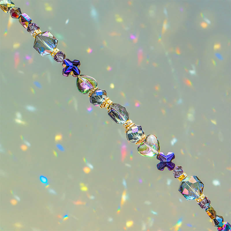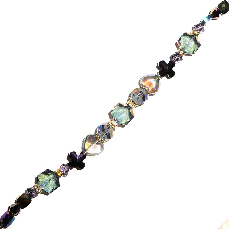 This dark and elegant 7-inch glass bead strand features a blend of dark AB crystal glass beads. Each strand features a blend of faceted glass rondelles, faceted glass cross shapes, faceted glass hexagons, glass hearts, faceted glass bicones, and more. Largest bead on strand measures 15mm x 14mm x 8mm. Smallest piece measures 6mm x 2mm. Each set of strung beads features 28 beads.