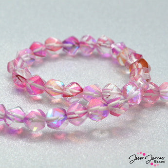Infuse your jewelry designs with the soft magical glow these stunning faceted AB pink beads offer. Each 8mm bead is expertly cut with multiple facets that reflect light from every angle, giving each jewelry piece a spectacular sparkle. The delicate pink color is enhanced by an AB coating, giving the beads an iridescent finish that shifts in color. Each set includes 48 beads.