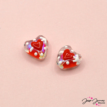 These adorable lampwork beads feature a playful heart shape with rich red accents. 2 beads per set. Each bead measures 14mm.