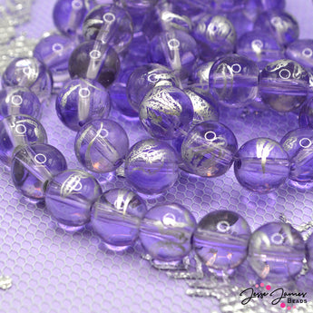 These beautiful semi-transparent, purple orbs feature stunning silver decal accents. Each bead measures 10mm. 80 beads per strand.
