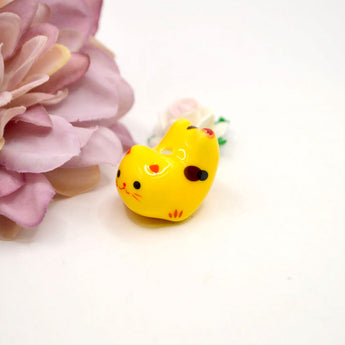 Meet Taco! This lively kitty bead is ready to jump into your next handmade jewelry project. Taco is a handmade printed porcelain bead featuring a bright golden yellow base with rich brown and red accents. He measures approximately 21mm x 14mm x 15mm. With a 2mm hole size, this adorable cat bead is ready to be strung onto your favorite chain, cord, and more.