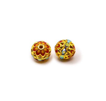 Ready to rock out? These radiant 10mm red round beads are crafted from golden brass and adorned with shimmering rhinestones for maximum brilliance. Glossy enamel detailing adds a colorful, high-contrast finish, giving each bead a bold and polished look. With a 1.2mm hole, they’re perfect for stringing onto fine chains, beading wire, or stretch cord. Use them as dazzling focal points in earrings, bracelets, or layered necklaces. Sold as a pair, these beads bring the perfect balance of shine and sophistication to any jewelry design.