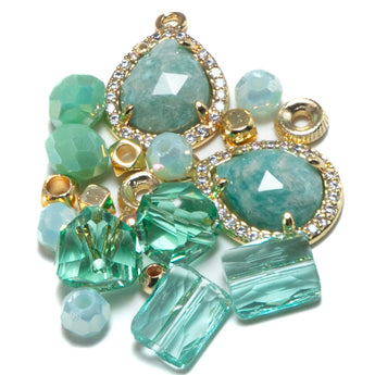 Dive into a dreamy blend of oceanic blues and tranquil teals with this serene mix of glass beads and bright gold accents. Finished with whimsical charms, it's perfect for crafting peaceful, water-inspired pieces that feel like a daydream beneath the waves. Largest piece measures 16mm. Smallest piece measures 4mm.